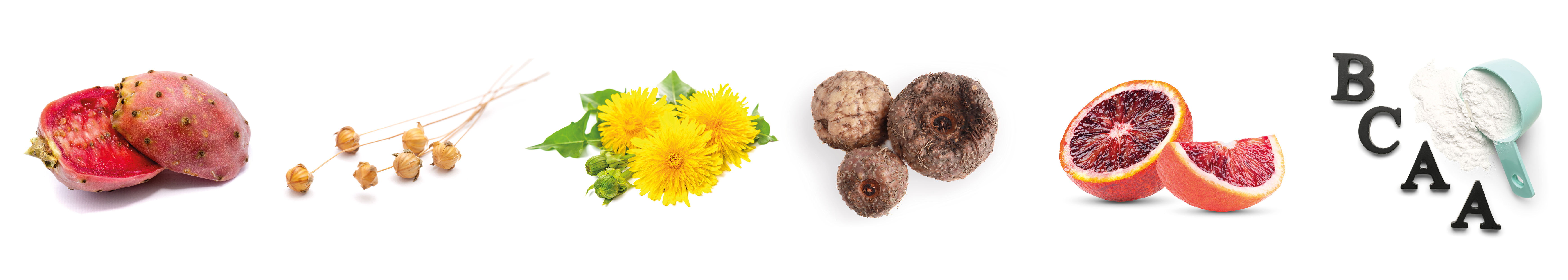 Zelený čaj, ľan, púpava lekárska, opuncia, vinič hroznorodý, zeler, hrachový proteín (BCAA), konjakový glukomanán, Acetyl-L-karnitín, L-Citrulín, Synefrín