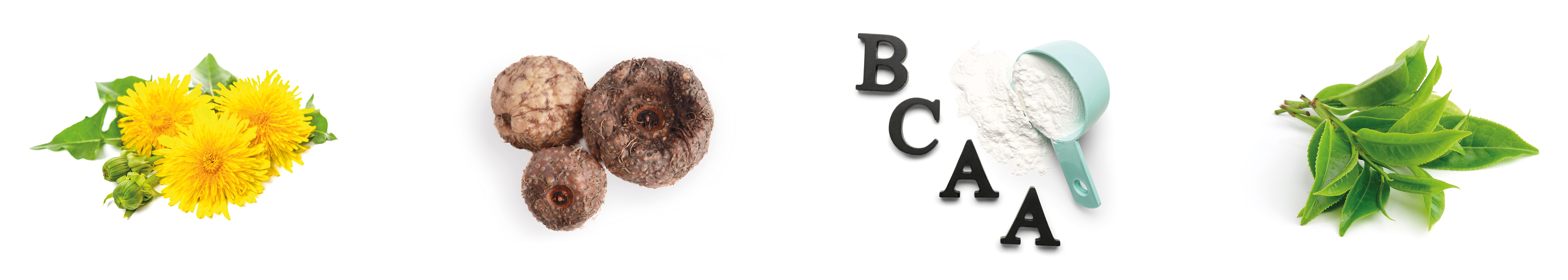 Účinné látky: 1zelený čaj, teín, 2púpava lekárska, synefrín, konjakový glukomanán (70%) a diétna vláknina, L-karnitín, BCAA komplex esenciálnych aminokyselín (leucín 46%, izoleucín 27%, valín 27%).