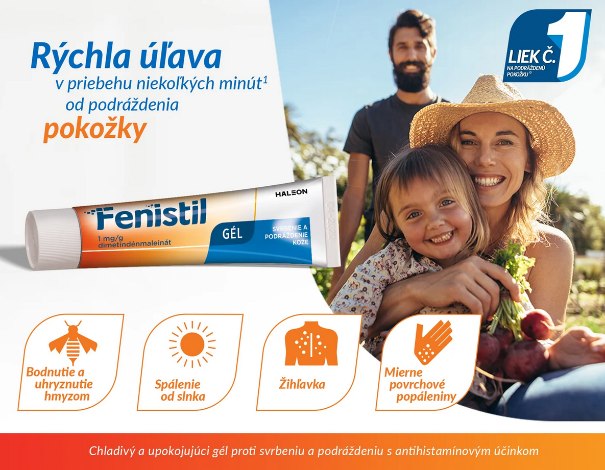 Fenistil gél rýchlo preniká do kože, neobsahuje alkohol, parfumy ani farbivá a je vhodný na použitie pre deti i dospelých.