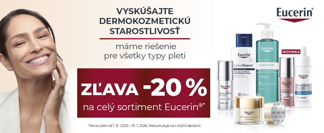Chcete vyskúšať kozmetiku Eucerin? Potom sledujte našu ponuku a špeciálne akcie, ako je napríklad Eucerin akcia 2+1, prípadne časté zľavy na najpredávanejšie produkty tejto značky, ako je aj Eucerin Hyaluron-Filler krém alebo Eucerin Antipigment lokálny korektor. Doprajte svojej pokožke tú najlepšiu starostlivosť za výhodnú cenu!