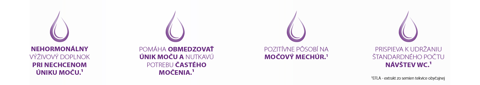 Obsahuje 1EFLA – extrakt zo semien tekvice obyčajnej, ktorý napomáha udržať štandardný počet návštev WC.