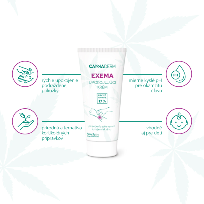 Cannaderm Exema – upokojujúci krém na ekzémy s mierne kyslým pH je určený pre starostlivosť o svrbiacu, citlivú a podráždenú pokožku pri prejavoch ekzému u detí i dospelých.
