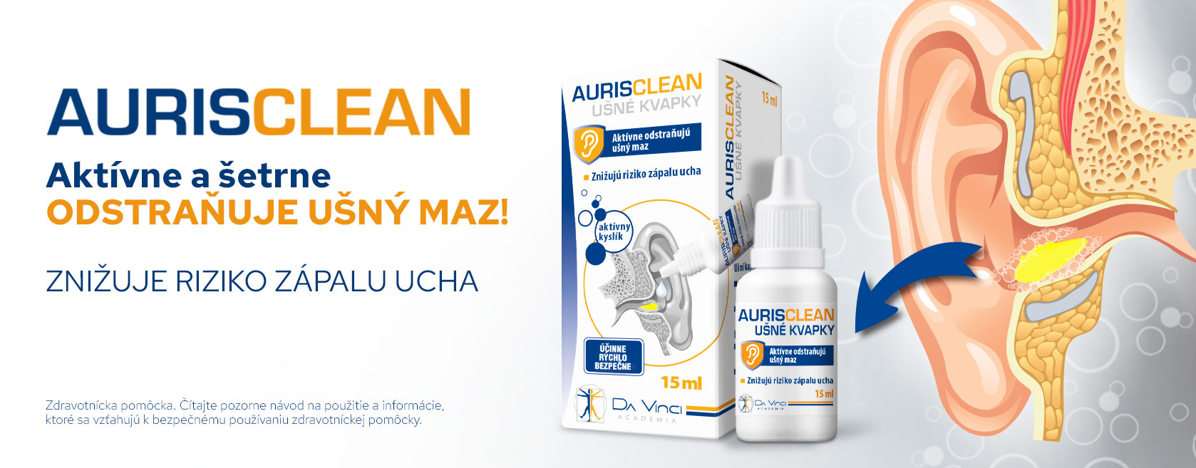 Aktívne odstraňuje ušný maz, znižuje riziko zápalu ucha. AurisClean ušné kvapky účinne odstraňujú nadmerný ušný maz.
