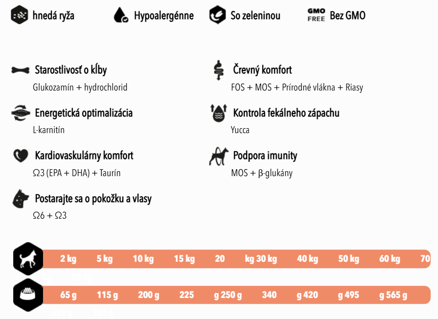 Hrubý proteín 26,00%, Hrubý tuk 16,00%, Hrubá vláknina 2,50%, Hrubý popol 7,90%, Vápnik 1,80%, Fosfor 1,00%, Vlhkosť 9,00% Glukosamín hydrochlorid 320 mg/kg, Chondroritin sulfát 320 mg/kg, Nutdrorit sulfát 20mg Vitamín A 20 000 IU/kg, vitamín D-31 800 IU/kg, vitamín E (all-rac-a-tokoferylacetát) 200 mg/kg, vitamín C 100 mg/kg, L-karnitín 40 mg/kg Kg., Taurín 500 mg/kg, Železo (monohydrát síranu železnatého) 75. mg/kg, meď (pentahydrát síranu meďnatého) 10 mg/kg, mangán (monohydrát síranu manganatého) 25 mg/kg, zinok (monohydrát síranu zinočnatého) 110 mg/kg, jód (jodid draselný) 2 mg/ Kg., Selén (seleničitan sodný) 0,1 mg/kg.,