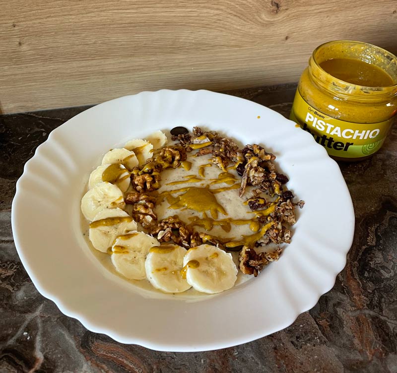 Najviac mi pistáciové maslo chutí v kaši. Ak pridáte do kaše nejaké ovocie a granolu, alebo čokoľvek čo máte radi, po pridaní masla už netreba žiadne oriešky.