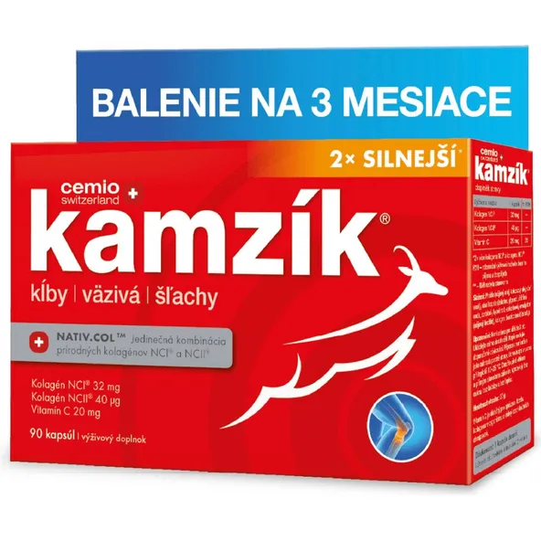 Cemio KAMZÍK® je špičkový kĺbový prípravok, ktorý jediný v Slovenskej republike obsahuje kombináciu natívneho kolagénu NCI®, natívneho kolagénu NCII® a vitamínu C. Predstavuje jedinečné spojenie rýdzej prírody a špičkovej technológie. Teraz je navyše 2× silnejší.*