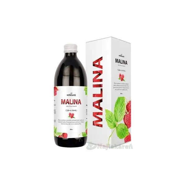 Výživový doplnok, 100 % pasterizovaná šťava vyrobená z plodov maliny (Rubus ideaus L.) s prídavkom vitamínu C.
