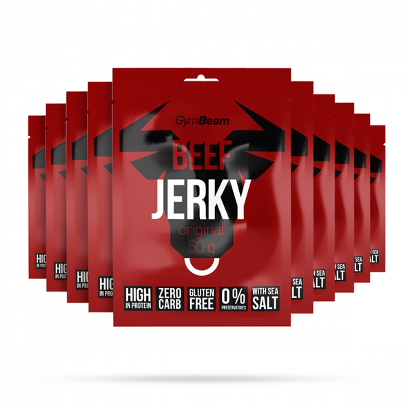Sušené mäso Beef Jerky je prémiový snack zo 100% hovädzieho mäsa prvotriednej kvality. Vzniká krájaním mäsa na tenké plátky a jeho následným sušením. Vďaka moderným technológiám sa zabraňuje jeho znehodnoteniu, a aj po otvorení zostáva dlho čerstvé, pričom si zachováva všetky potrebné nutričné benefity. Vyznačuje sa výnimočným podielom proteínov a minimom tukov a sacharidov. V balení sa nachádza od 34,6 po 64 % bielkovín, v závislosti od príchute. Navyše, na výrobu 100 g lahodného sušeného mäsa je použitých až 320 g surového hovädzieho mäsa. Kombinácia tradičnej receptúry a vynikajúcej chuti robí z Beef Jerky ideálny snack pre dodanie sily a okamžité zahnanie hladu. Stačí len otvoriť, privoňať a vychutnať si nádych divokého západu.