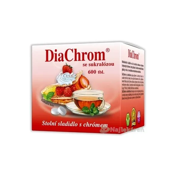 DiaChrom so sukralózou je nízkokalorické stolové sladidlo novej generácie na báze sukralózy (E 955) obohatené chrómom. Chróm prispieva k udržaniu normálnej hladiny glukózy v krvi a prispieva k správnej látkovej premene makronutrientov ( min. 6 mikrogramov Cr/deň tj. 4 tabletky DiaChromu so sukralózou).
