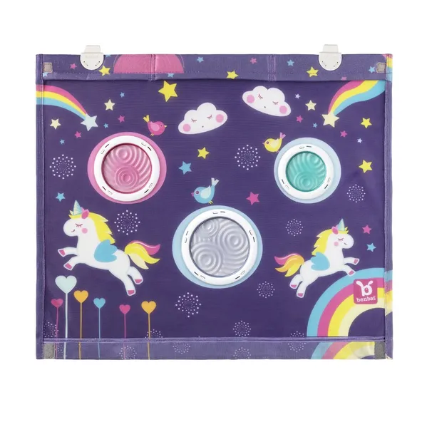 Slnečná clona do auta bola špeciálne navrhnutá tak, aby vytvorila farebné prostredie a zaujala vaše dieťa na cestách. Prirodzené denné svetlo vytvára fascinujúce textúry prostredníctvom farebných bublín, ktoré vizuálne stimulujú zmysly vášho dieťaťa. Hoci sieťový materiál chráni vaše dieťa pred slnkom, filtruje svetlo bez toho, aby obmedzoval výhľad, čo umožňuje maximálnu bezpečnosť. Nevyhnutný výrobok pre zábavnú a veselú jazdu.