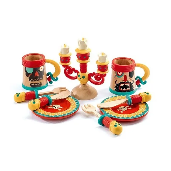 Pestrofarebná drevená súprava je ideálna na oslavu pirátskeho víťazstva. Súprava obsahuje dva tanieriky, dva príbory, dva korbely na lahodný mok, jeden svietnik s dekoráciami pirátov a to všetko na krásne farebnej podložke.