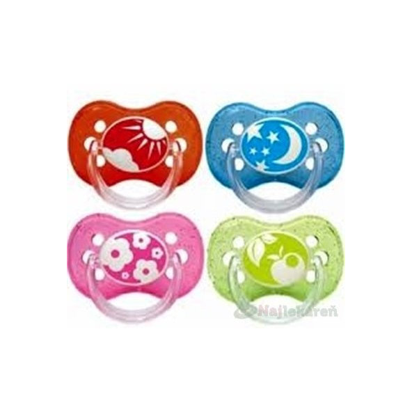 - Ventilačné otvory v štítku cumlíka umožňujú cirkuláciu vzduchu, odvod slín a zabraňujú tak podráždeniu pokožky okolo úst dieťaťa;