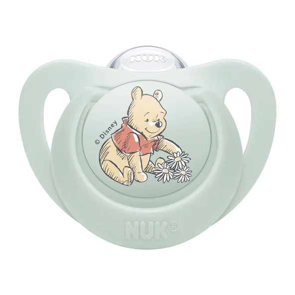 NUK Disney Macko Pú silikónový cumlík pre správny vývoj ústnej dutiny dieťaťa, vek 0-6 mesiacov, 1 ks v balení.