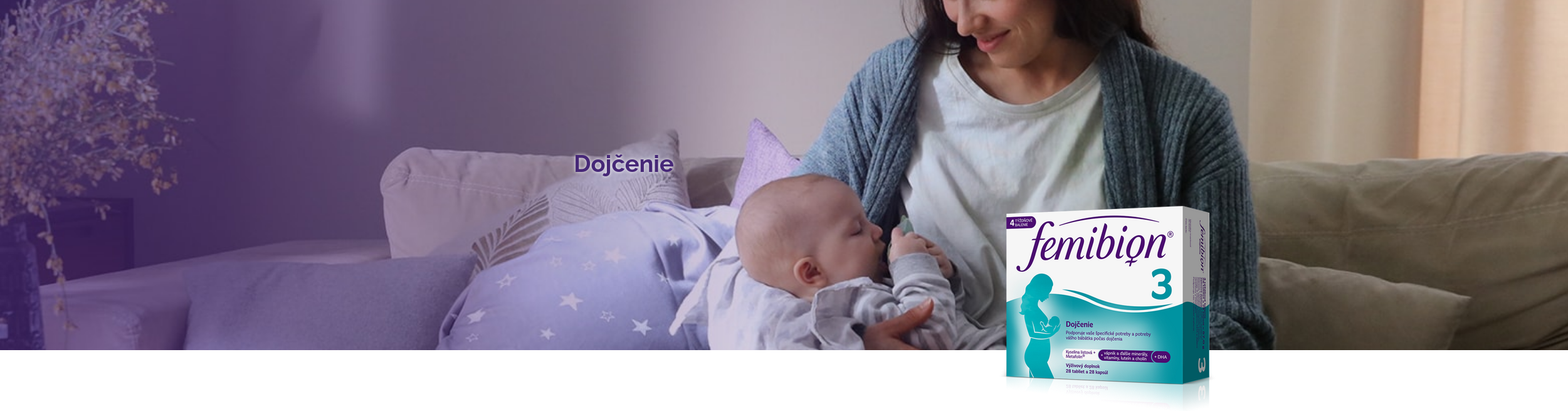 Femibion® 3 ti dodáva starostlivo vybrané látky vrátane DHA, ktoré podporujú ženu počas tohto obdobia ako doplnok k pestrej strave. Obsahuje aj foláty, vitamíny D a A, železo, vápnik, cholín, luteín a ďalšie látky (jód, selén, zinok, vitamíny B, C a E). Železo pomáha znižovať vyčerpanosť a únavu, vápnik prispieva k udržiavaniu normálnych kostí. Počas dojčenia je zvýšená potreba cholínu, ktorý má úlohu v metabolizme lipidov. Femibion® 3 obsahuje omega-3 mastnú kyselinu DHA a luteín v samostatnej kapsule. Luteín dodáva kapsule charakteristickú farbu.