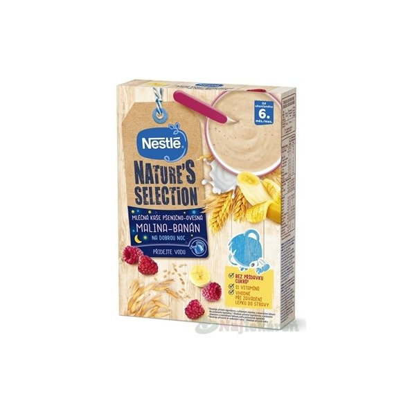 Nestlé pšenično-ovsená mliečna kaša s príchuťou maliny a banánu vhodná pre deti od ukončeného 6. mesiaca.