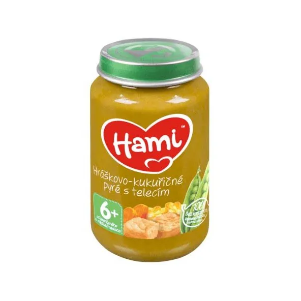 Hami hráškovo-kukuričné pyré s teľacím mäsom je príkrm v praktickom balení vyrobený z najkvalitnejšej zeleniny, ktorá si vďaka spracovaniu v pare uchováva vitamíny a minerály, a z mäsa dodávaného z overených fariem.