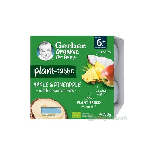 GERBER Organic 100% rastlinný dezert jablko ananás s kokosovým mliekom. BIO ovocná desiata. Od ukončeného 6. mesiaca. Pasterizované. Balené v ochrannej atmosfére.