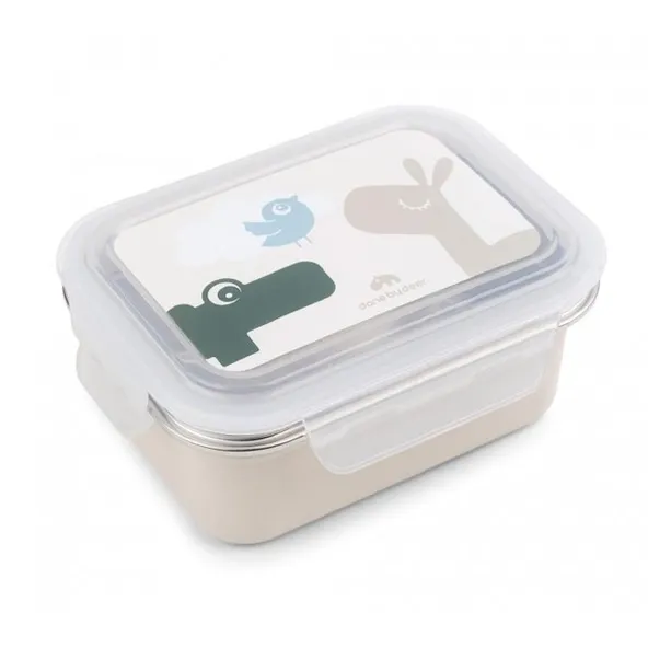 Kovový obedový box s Croco a Lalee Vám nesmie chýbať na cestách! Nerezová krabička je ideálna pre obed Vašich najmenších a plastové veko ju parádne utesní. Obedový box je vyrobený z kvalitnej ocele - nerezovej ocele 18/8 - vďaka čomu je veľmi odolný a má dlhú životnosť. Vnútri krabičky nie sú žiadne potlače, krabička neuvoľňuje žiadnu chuť, vôňu ani chemikálie. Praktický kovový obedový box je v pieskovo béžovom tóne. Veko zdobia jelenia priatelia Croco, Lalee a Birdee v jemných odtieňoch zelenej, pieskovej a modrej.
