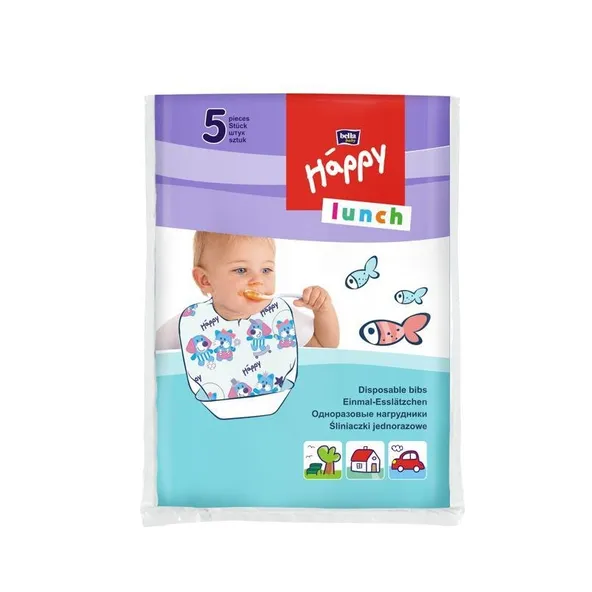 Jednorazové podbradníky Happy Lunch sú dokonalou alternatívou látkových podbradníkov. Vonkajšia savá vrstva z netkanej textílie spolu so zadnou fóliovou vrstvou skvele chráni odev dieťaťa pred znečistením.
