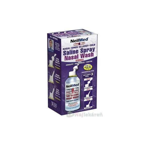 NasaMist All-In-One je prírodný, soľný roztok na hydratáciu nosa a pre jeho oplach, pomáha zmierniť alergickú nádchu, suchosť nosovej sliznice.