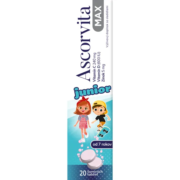 Výživový doplnok Ascorvita MAX junior pre deti od 7 rokov vo forme šumivých tabliet pre podporu normálnej činnosti imunitného systému. S obsahom vitamínu C (240 mg), vitamínu D (15 µg) a zinku (5 mg).
