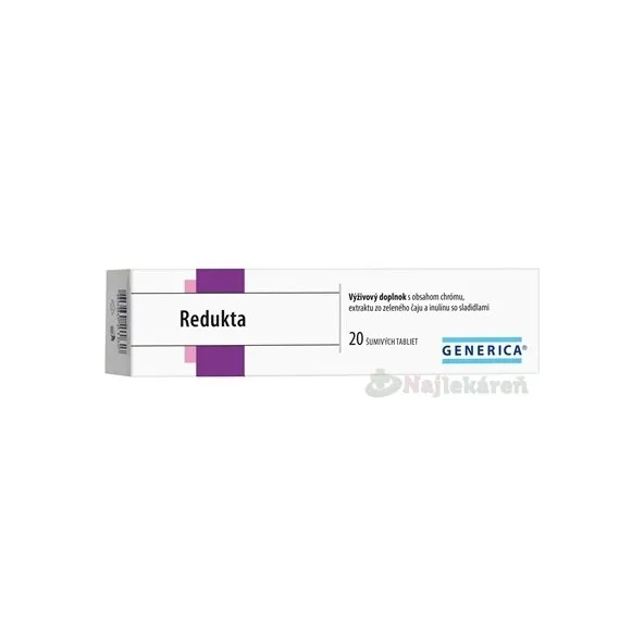 Výživový doplnok GENERICA Redukta s obsahom chrómu, extraktu zo zeleného čaju a inulínu so sladidlami.