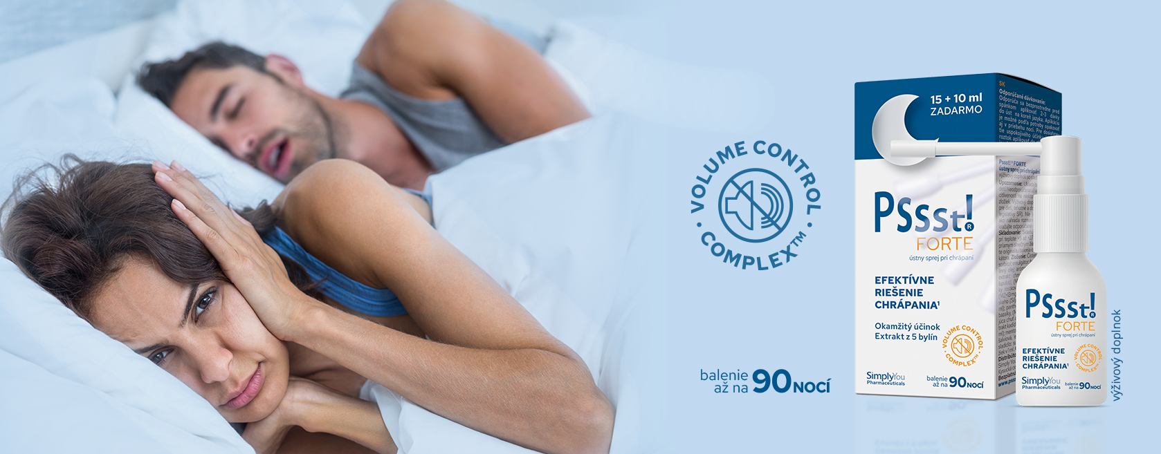 Pssst! FORTE ústny sprej pri chrápaní je výživový doplnok, ktorý obsahuje unikátnu účinnú zložku VOLUME CONTROL COMPLEX™, ktorá pôsobí na mäkké časti horných dýchacích ciest.