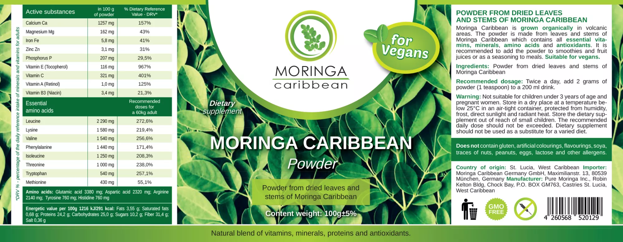 Prášok vyrobený zo sušených listov a stoniek stromu Moringa, obsahuje vitamíny, minerály, esenciálne aminokyseliny a antioxidanty. Moringa Caribbean je pestovaná ekologickým spôsobom vo vulkanickej oblasti ostrova St. Lucia.