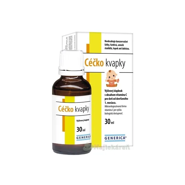 Výživový doplnok s obsahom vitamínu C pre deti od dovŕšeného 1. mesiaca. Céčko kvapky obsahujú vitamín C vyrobený technológiou mikroenkapsulácie.