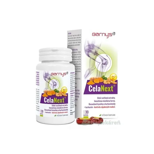 Obsah zložiek v 1 kapsule (0,645 g): patentovaná zmes koncentrovaných rastlinných extraktov CELANEXT® v micelárnej forme 550 mg [emulgátor - polysorbát 80; emulgátor - polysorbát 20; kadidlovník pílovitý (Boswellia serrata) 33 mg extraktu zo živice, boswelové kyseliny ≥ 6 %; kurkuma dlhá (Curcuma longa) 16,50 mg extraktu z podzemku, kurkuminoidy ≥ 3 %; destilovaná voda; vitamín D3 (cholekalciferol) 5,5 µg (110 % RVH)]; objemové činidlo (hydroxypropylmetylcelulóza). RVH – referenčná výživová hodnota. Viac na adc.sk