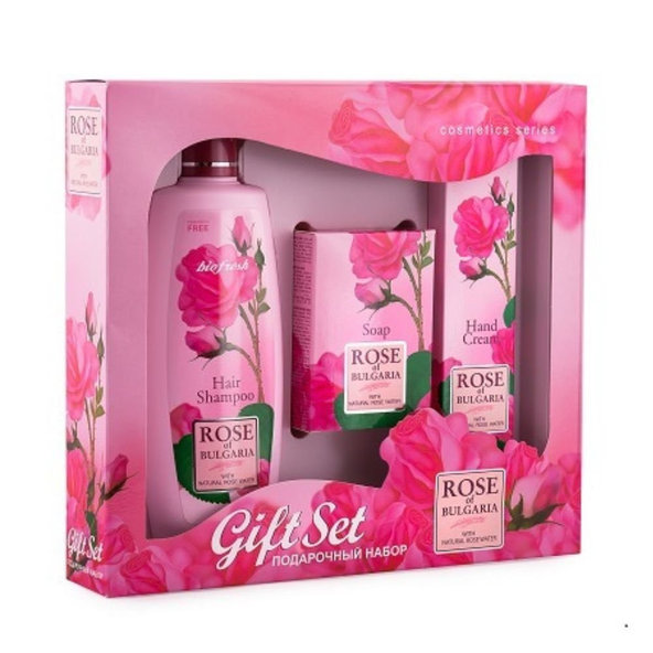 Darčekový set, ktorý poteší nejednu ženu. Po umytí vlasov so šampónom z ruží budú vlasy vyživené a hydratované. Je vhodný pre všetky typy vlasov. Mydlo z ruží obsahuje jemné peelingové častice sušených ružových lístkov, palmový a kokosový olej bez konzervačných látok. Krém na ruky má antibakteriálne a upokojujúce účinky.