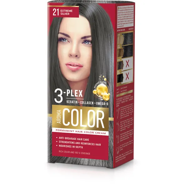 Sila keratínu, kolagénu a omega-9 kyselín v inovatívnom komplexe 3-plex. Aktívny komplex Aroma Color 3-plex je bohatý na aminokyseliny a proteíny. Špeciálne vytvorené pre slabé, poškodené a ošetrené vlasy. Stará sa o vlasy zvnútra aj zvonka, chráni ich pred rozbitím a vyživuje do hĺbky. Trvalý krém na vlasy Aroma Color s aktívnym komplexom 3-plexu keratín, kolagén a omega-9 kyseliny pre vitálne a vyživené vlasy. Obohatená receptúra chráni vlasy pred lámaním počas farbenia, posilnenie vlasovej štruktúry a zlepšenie elasticity. Vďaka vďaka inovácii 3-plexu sú vlasy silnejšie, hydratované a obnovené. Zabudnite na biele vlasy a užívajte si ešte krajšie a živšie vlasy s lesklými a sýtymi farbami celé týždne. Aroma Color ponúka na výber viac ako 30 intenzívnych a brilantných odtieňov.