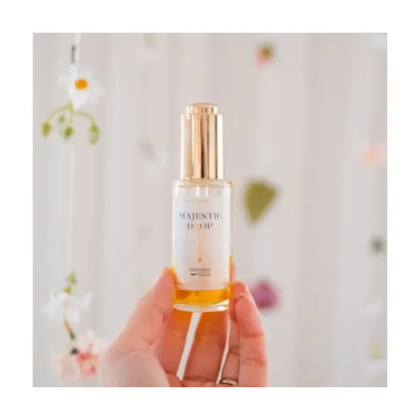 Nočný elixír Majestic drop okrem troch unikátnych účinných látok obsahuje neoceniteľné prírodné oleje pre hebkosť a výživu: rakytník, ovos, šalát, baobab, kaméliu, ako aj ušľachtilé arómy pre zmysly esenciálnych olejov neroli, santalového dreva, immortelle.