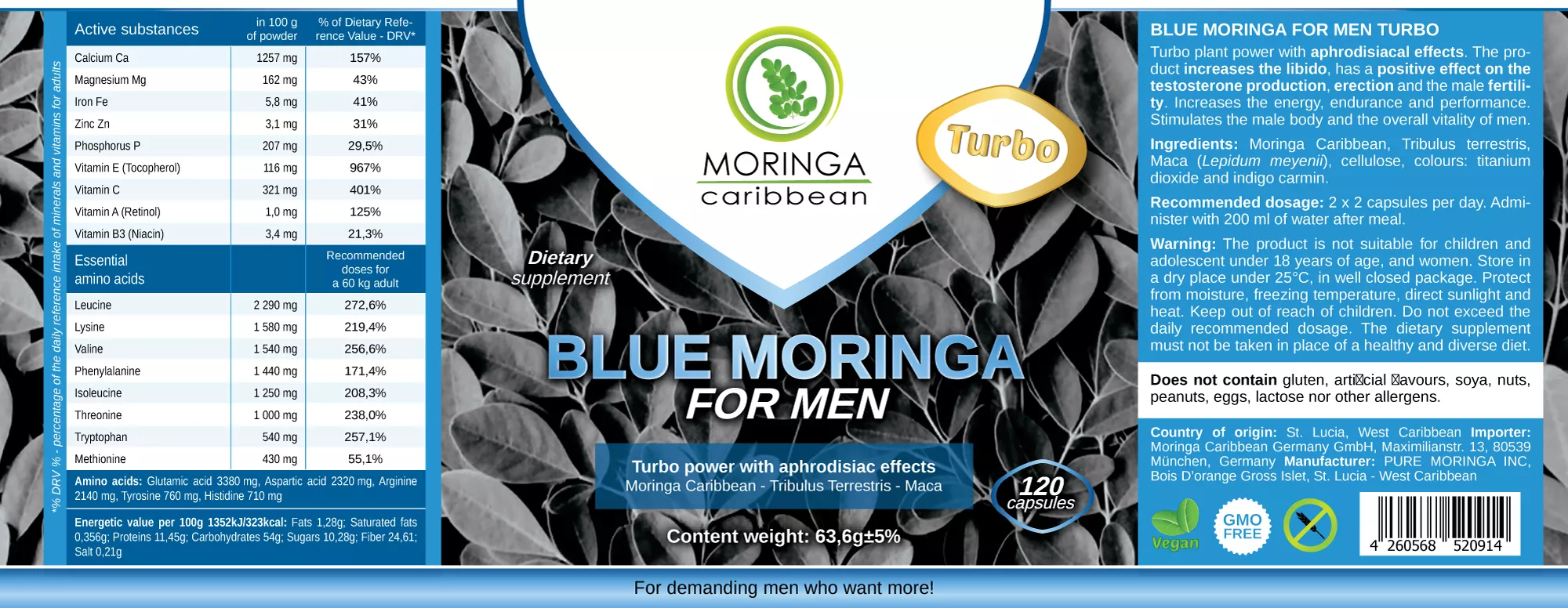 Výživový doplnok Blue Moringa Turbo pre mužov obsahuje kombináciu sušených listov Moringy Karibskej, výťažku z Tribulus terrestris a koreňa rastliny Maca.