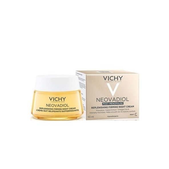 VICHY NEOVADIOL Relipidačný remodelačný nočný krém pre obdobie postmenopauzy. Laboratóriá Vichy vyvinuli výživný a spevňujúci krém s obsahom Termálnej vody Vichy vulkanického pôvodu obohatenej o 15 minerálov, Pro-Xylanu, výťažku z kasie, vitamínu B3 a omega 3-6-9 mastných kyselín z rastlinných olejov.