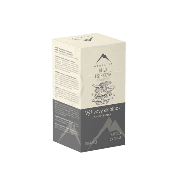 Hrotlife Hliva ustricová s vitamínom C 60cps. obsahuje širokú škálu biologicky aktívnych látok dôležitých pre zdravie - betaglukány, hubovú vlákninu a další. Vďaka obsahu vitamínu C pomáha udržať obranyschopnosť organizmu a prispieva k zníženiu únavy a vyčerpania.