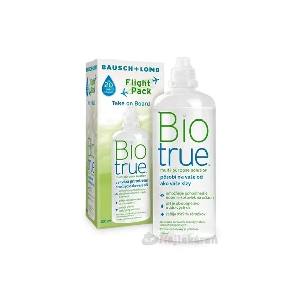 Použitie Biotrue multi-purpose solution flight pack roztok na kontaktné šošovky