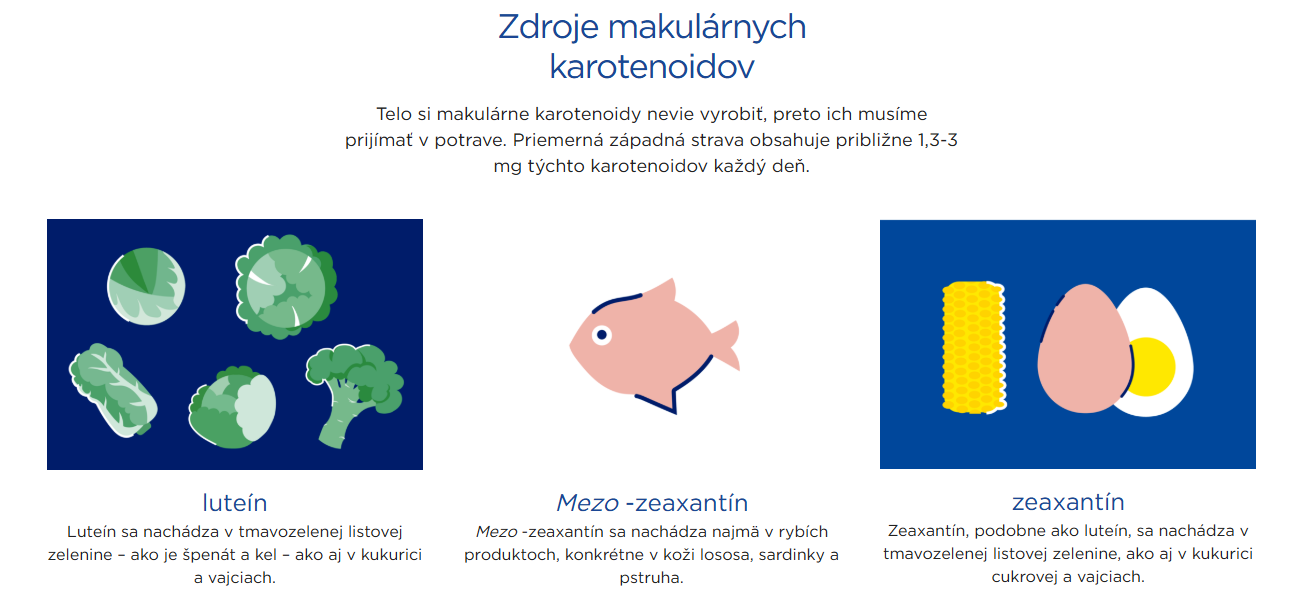 Už dlhú dobu je vedecky dokázané, že žlté farbivo, pigment uvnitř makuly, ktorá je centrom nejostrejšieho videnia oka, tvoria tri druhy karotenoidov: Lutein, Zeaxantin a Mezo-Zeaxantin.
