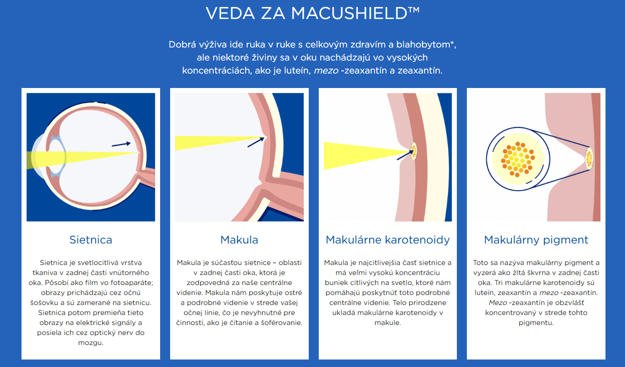 Macushield je jedinečný patentovaný doplnok stravy, ktorý obsahuje všetky tri karotenoidy, ktoré sa vyskytujú v makule, vrátane Mezo-Zeaxantinu.