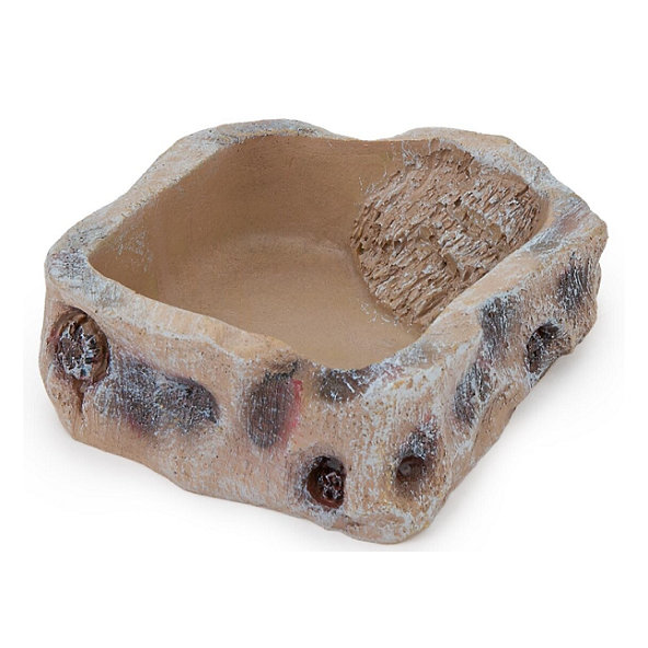 Esteticky vyrobená teráriová miska zdobená kameňmi dokonale zapadá do okolia a je usporiadaná tak, aby pripomínala prírodné prostredie.