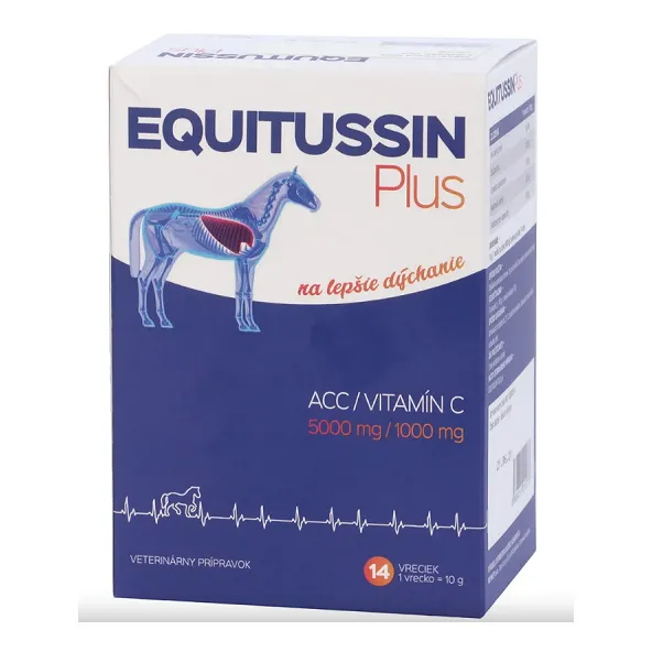 Equitussin Plus je registrovaný veterinárny prípravok pre kone určený na podporu liečby akútneho a chronického kašľa. Účinne pomáha tlmiť zápal v dýchacích cestách a urýchľuje ústup kašľa.