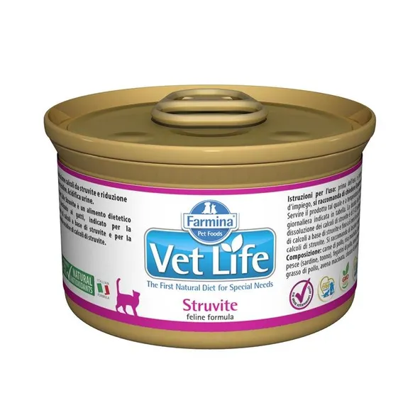 Farmina Vet Life Struvite je kompletné diétne krmivo pre dospelé mačky s receptúrou na rozpúšťanie struvitových kameňov a na zníženie rizika opakovanej tvorby struvitových kameňov.