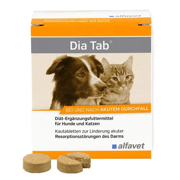 Diétne doplnkové krmivo pre psy a mačky Dia Tab® obsahuje vyvážené zloženie prírodných ingrediencií pre reguláciu narušených tráviacich procesov.