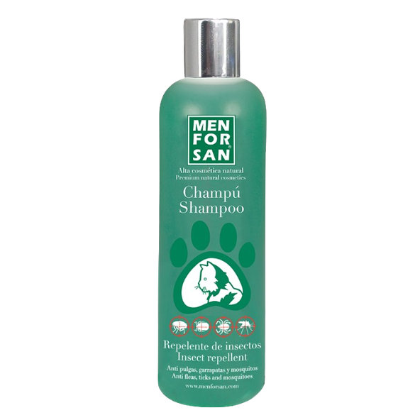 MEN FOR SAN špičkový šampón pre mačky s prírodnými repelentnými zložkami. Odstraňuje blchy, kliešte, ploštice a roztoče zo srsti a kože počas kúpania.