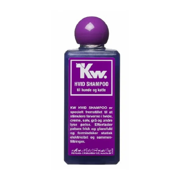 KW Šampón biely je šampón špeciálne vyrobený na stimuláciu farieb v bielej, striebornej, sivej (a iných svetlých farbách), ktorý stabilizuje štruktúru srsti, dodávajú jej lesk a vitalitu a odstraňuje statickú elektrinu.