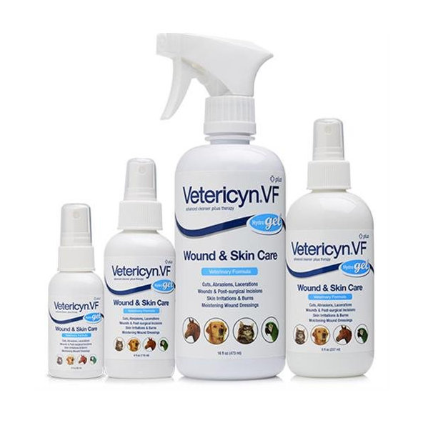 Vetericyn VF Hydrogel plus pre hojenie rán, nedráždivý, bezpečný v prípade olízania, alebo požitia zvieraťom, funguje na všetky typy zvieracej kože.
