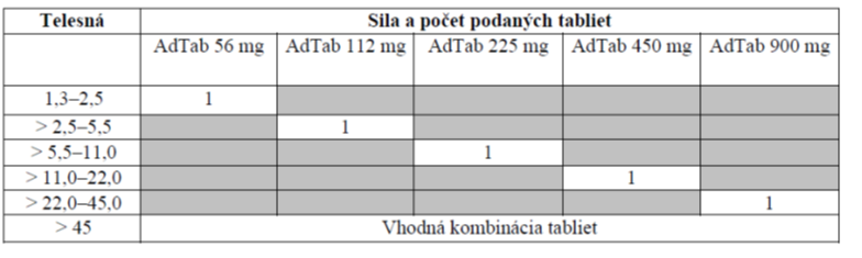 Pre psov s telesnou hmotnosťou nad 45 kg, použite vhodnú kombináciu dostupných síl, aby ste dosiahli odporúčanú dávku 20–43 mg/kg.