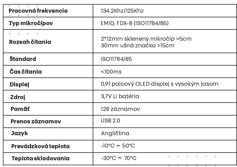 Charakteristika Zariadenie na čítanie mikročipov W8 White