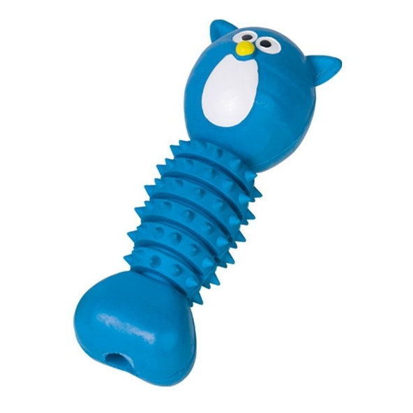 Zábavná gumová hračka pre psov v tvare kosti s mačacou hlavou s výstupkami na strednej časti a otvoromi na naplnenie maškrtami Nobby Solid Rubber Bone Cat 16,5cm v modrej farbe. Maškrty nie sú súčasťou balenia.