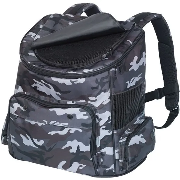 Maskáčový batoh Nobby Rumen na psa či mačku (do 7 kg), vyrobený z odolného umývateľného mikrovlákna. S plne nastaviteľnými popruhmi na ramene a vypchatou zadnej časti na pohodlné nosenie. Integrovaná karabína vnútri batohu zabraňuje vášmu psíkovi vo vyskočení von. Sieťové časti na batohu zaručujú cirkuláciu vzduchu vnútri aj pri zatvorenom batohu. Veľký vstupný otvor.